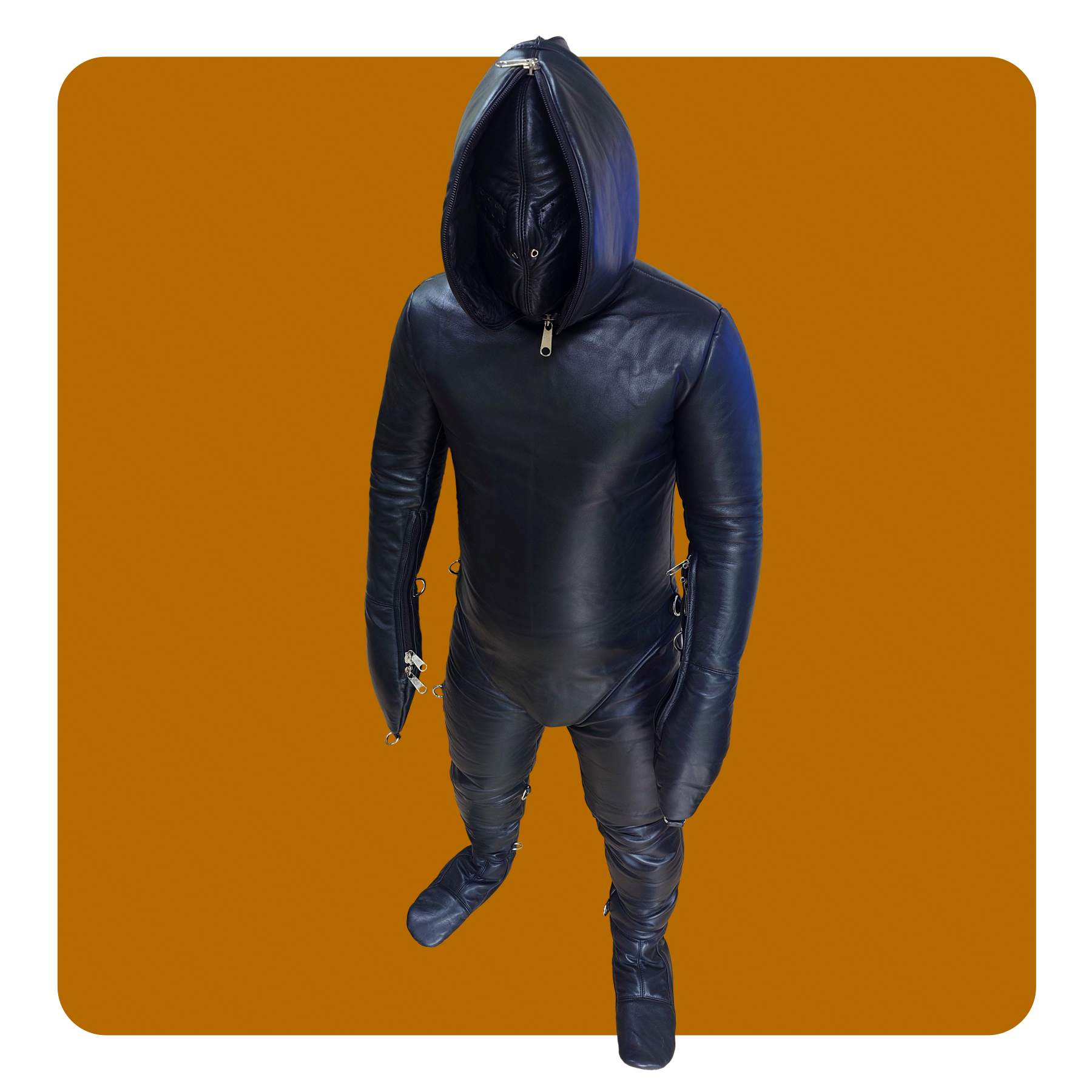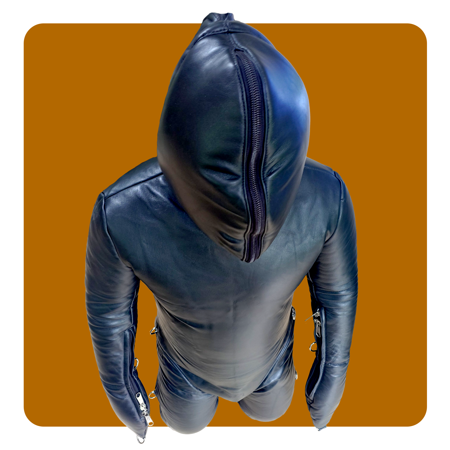 The hood can be configured as you wish but the base model has pepperpot eyes, nose grommets and closed mouth. But you can have any options you like here. The zips at the wrists and ankles help you into the suit but when closed seal you inside your leather prison. The rear zip goes from the top of the hood down to between the legs, meaning you have no access to any sort of pleasure, though the zip can be extended to go up to the stomach line if you wish. Nipple zips can be included free of charge so just let us know when ordering if you would like these.