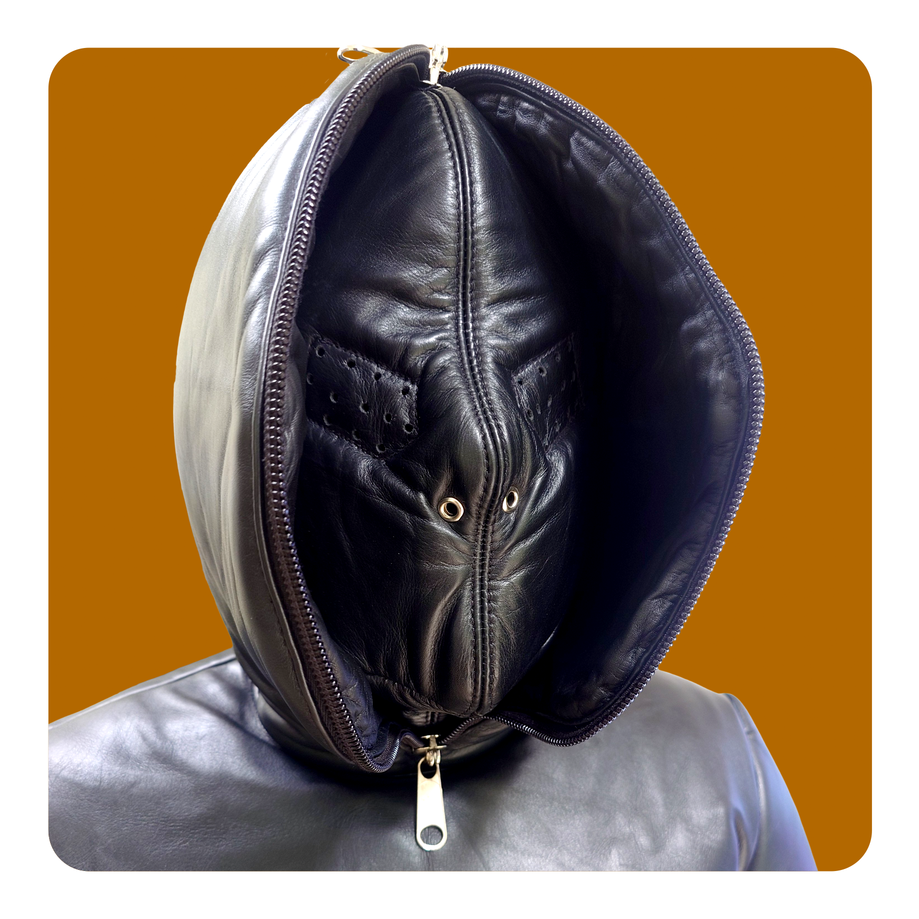 The hood has a second flap feature with a large front zip, which when sealed can completely close the head into darkness and a second leather skin !
