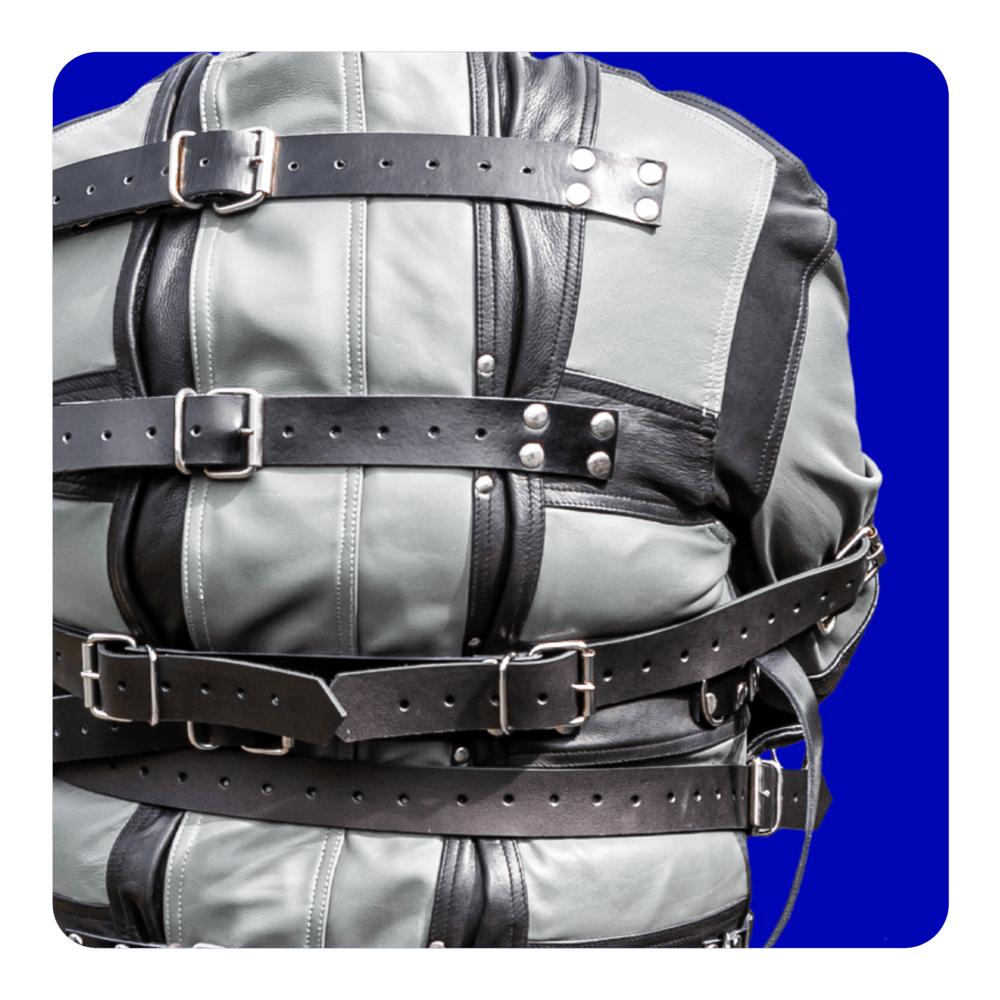Welcome to the LeatherPrison straitjacket. This is a straitjacket packed with lovely features and is well built, heavy and once in, you are not getting loose!